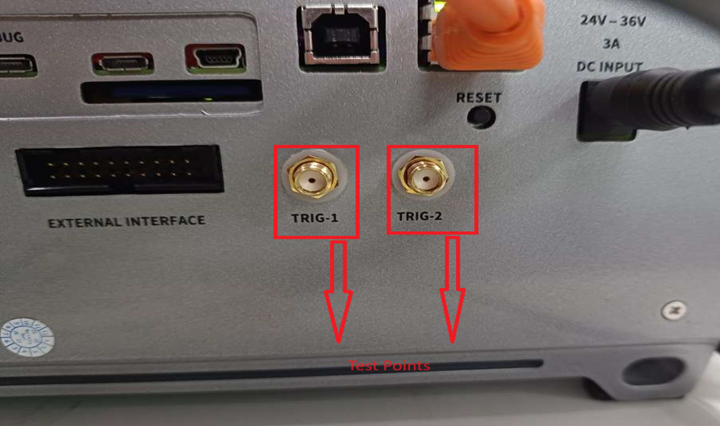 1. Connect the TRIG1 and TRIG2 test points to the scope channel-1 and channel-2 respectively as shown in the images below.
