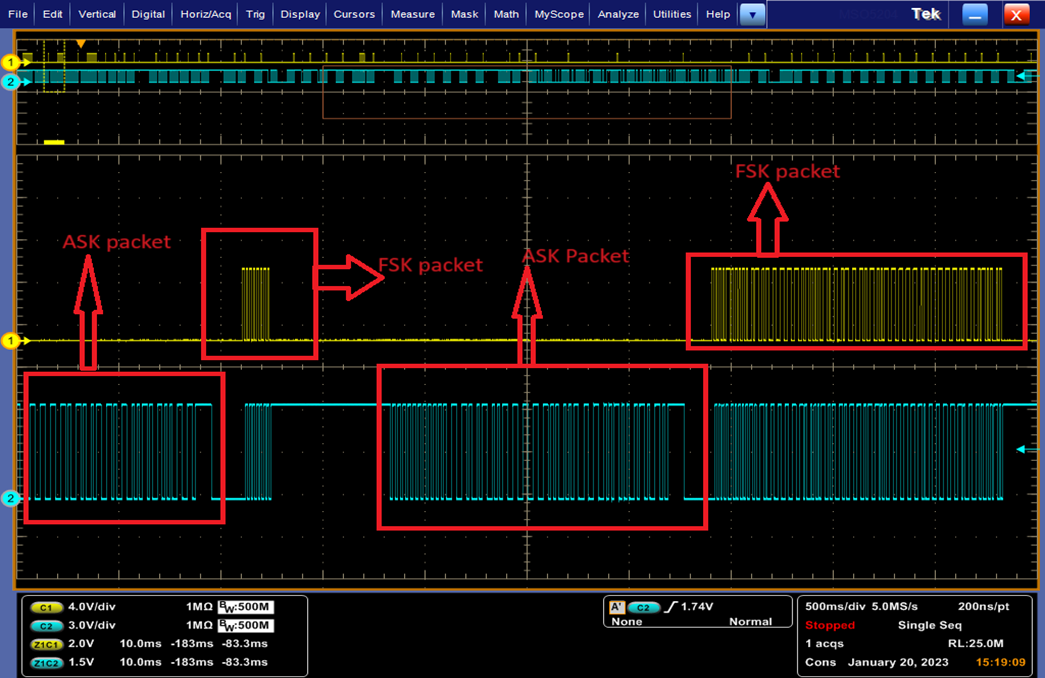 4. Analyze the FSK signal which is captured using the TRIG1 test point and ASK signal which is captured using the TRIG2 test point.
